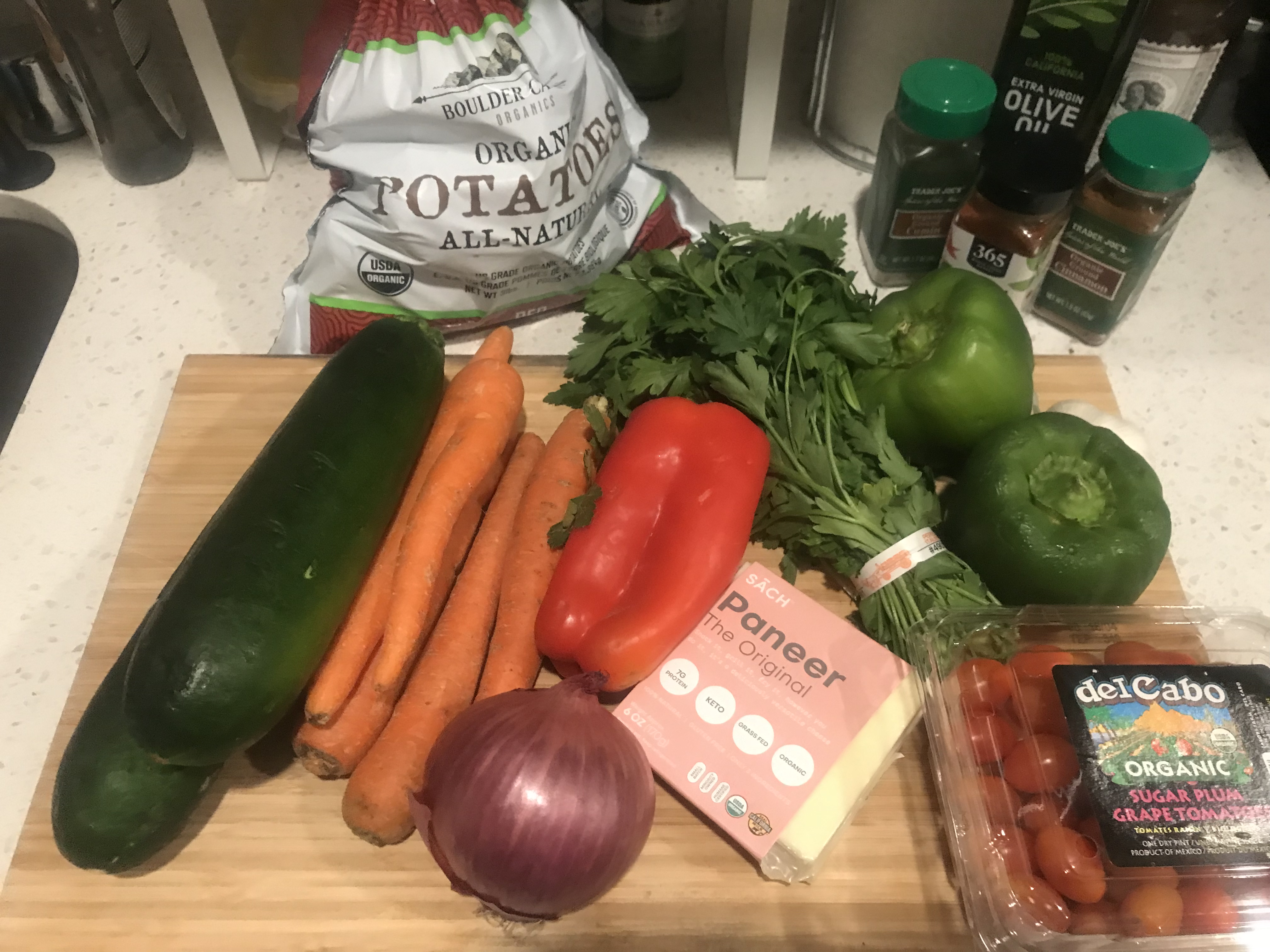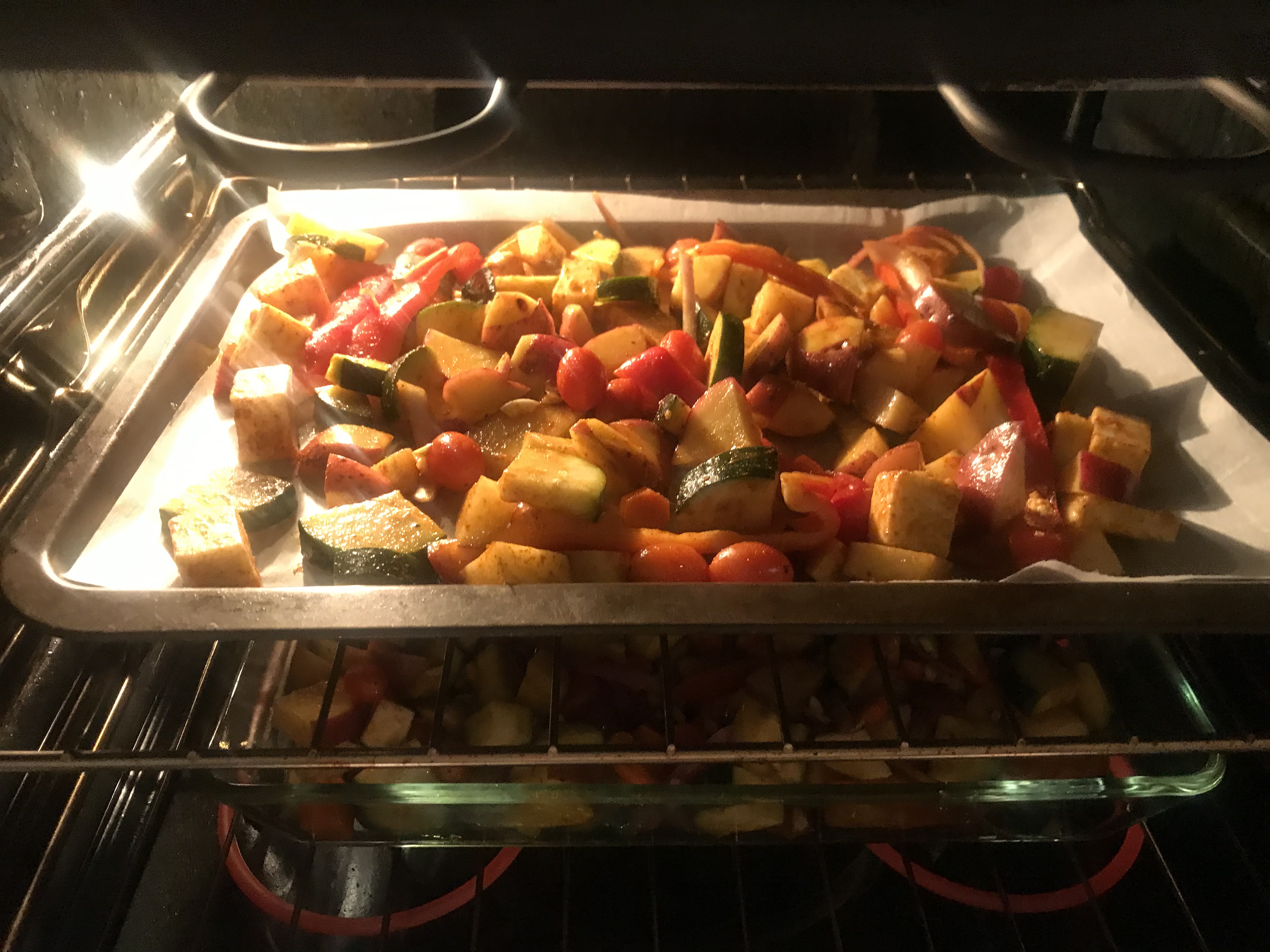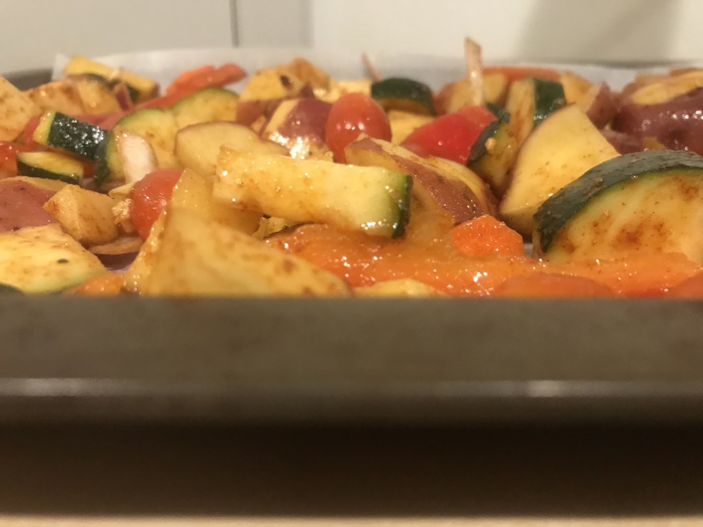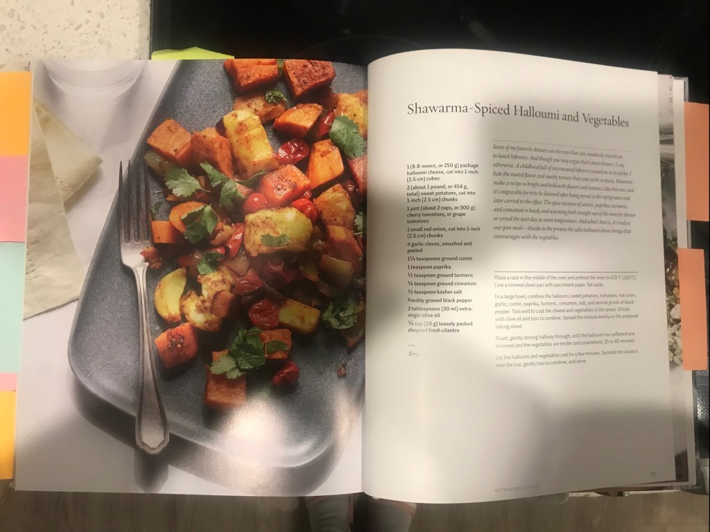 I generally make this on the weekend, so I can eat it for lunch the next week. I substitute paneer for the halloumi, because it’s easier for me to get, but I’m sure the halloumi would be just as good. I also add whatever vegetables I have on hand and feel like roasting. The recipe calls for sweet potatoes, cherry tomatoes and red onion. But, I add zucchini, carrots and red bell peppers as well. I also substitute red or golden baby potatoes for the sweet potatoes, because I’m not big on sweet root vegetables…